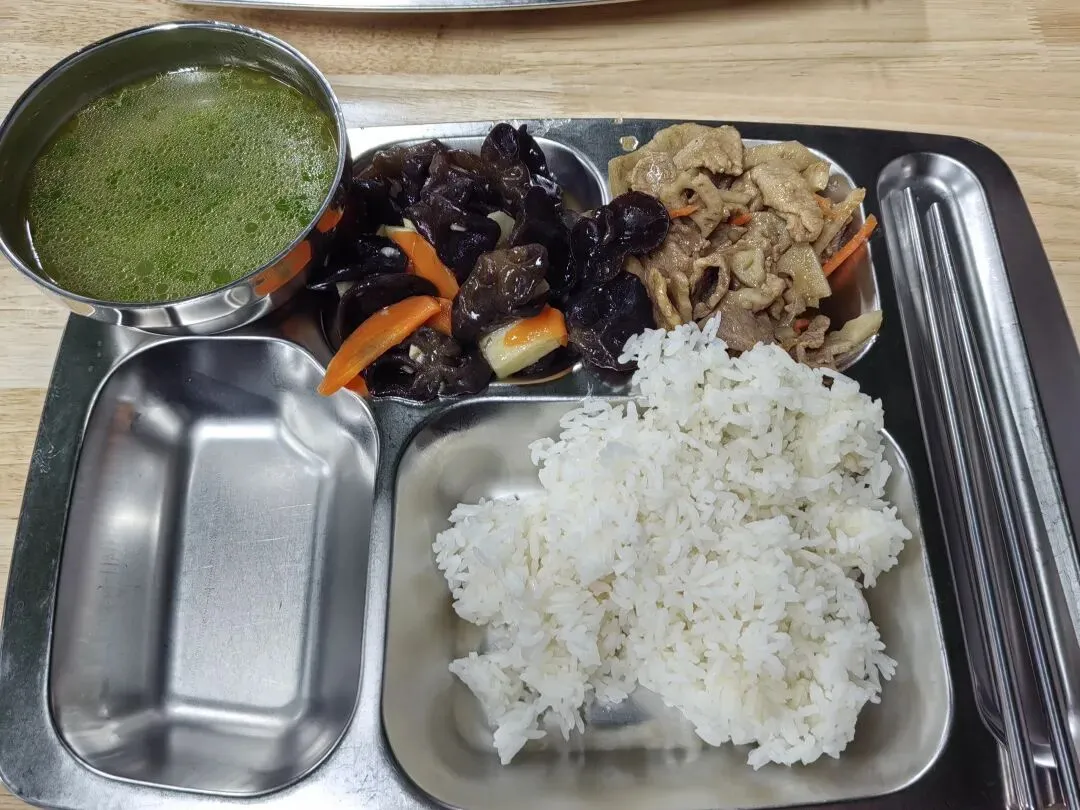 说起一些国营性质的餐饮店,现在好像真的不太多见了!记得小时候我还有幸见过不少,印象中就是那种中规中矩而且色调单一的装修风格!无论是收银员,还是打菜的阿姨又或者是厨师,都是统一的白色帽子和衣服,有的还会在身前挂上一条围裙!前些日子,我在南宁市民族大道的民族广场附近,竟然无意中看到了一家国营食堂!其实我也是在路边看到这家食堂的标识,于是跟着指引才找到的!藏得还挺深,如果没有指引,一般人还真不容易找得到!这家食堂和外面的快餐店相比,可以选择的菜色并不多,我当天去的时候,只有三肉二素的菜供顾客选择!价格标识也是相当的随意,就是简单的拿一张红色的打印纸直接粘贴在窗口上面!我点了一肉一素尝试看看,餐盘的各自都没有用完,还空了一个位置!说句实在话,个人觉得这里的饭菜还是相当不错的,就是那种传统的食堂饭菜的感觉,卖相虽然不算鲜艳,但是口感甚佳,有一些类似以前学校饭堂的样子!顺便提一下这碗青菜汤,好像是放了一点姜片进去调味,清甜中还带着少许的辛辣!最后,我们和大家分享一下这家饭堂的具体位置,确实不容易找,用几张图片作为指引说明一下:右转后,往前大概200米左右在这个路口右转,也就是整个商场的后门这里!再往前走大概100米左右,看到这个大门走进去,上到二楼就可以看到食堂了!说实话,如果没有标志指引,有谁会能想到这样一栋像单位办公大楼的地方,竟然还会有着这么一个国营食堂,而且还是对外开放的呢?