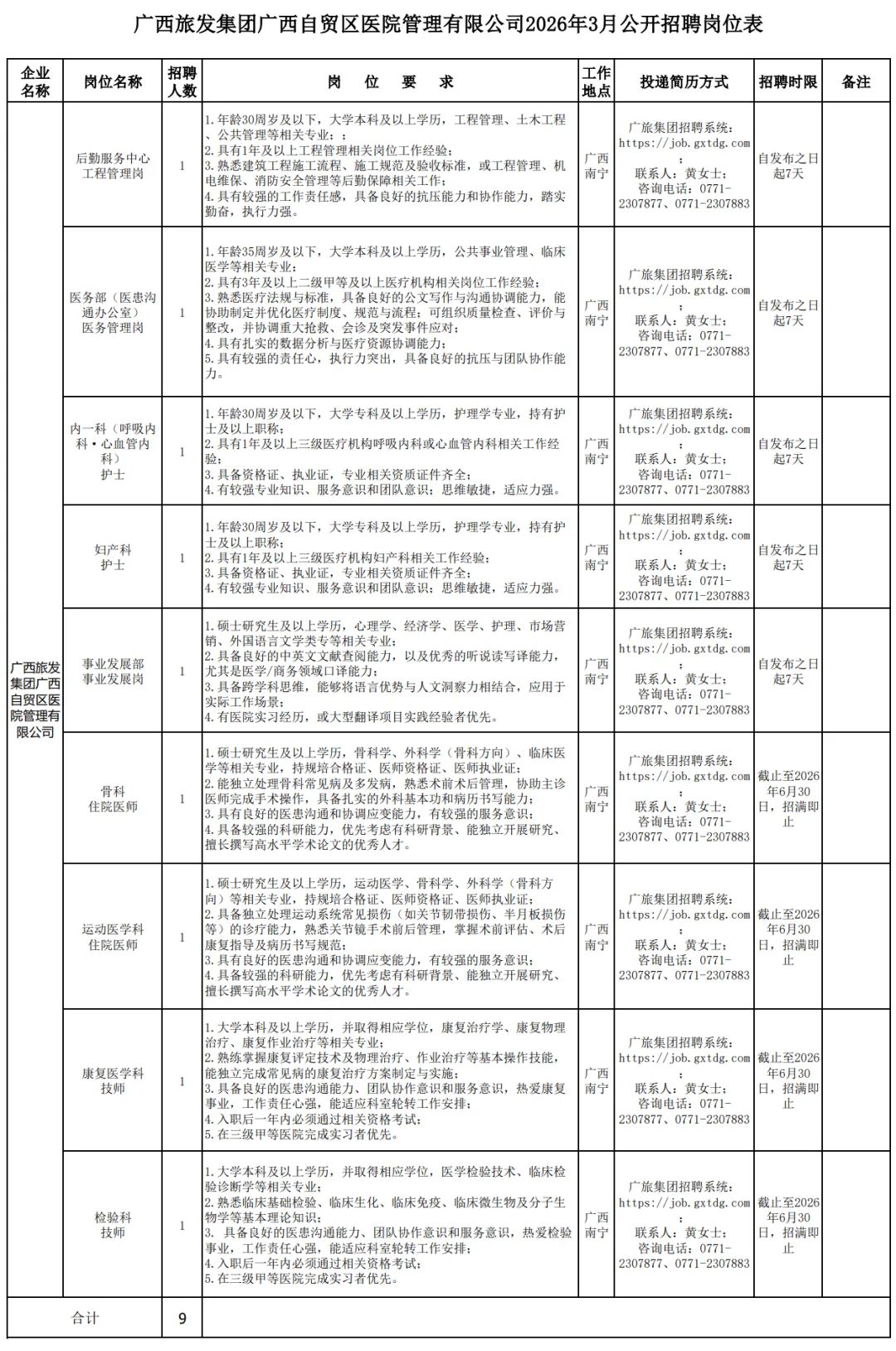 广西旅发集团广西自贸区医院管理有限公司2026年3月招聘9名工作人员启事