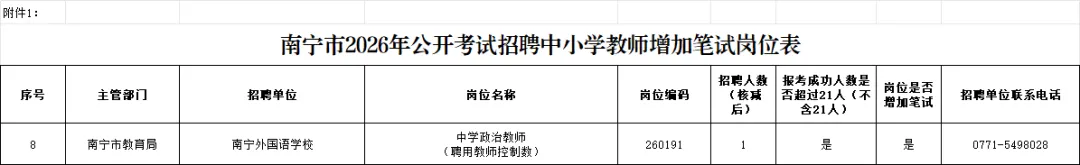 附件:1.南宁市2026年公开考试招聘中小学教师增加笔试岗位表