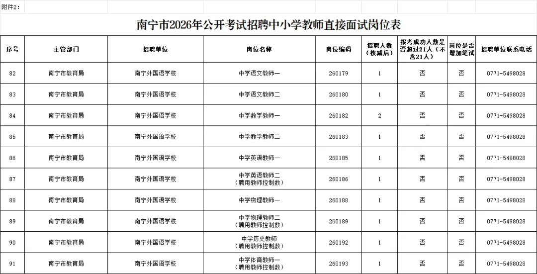 2.南宁市2026年公开考试招聘中小学教师直接面试岗位表