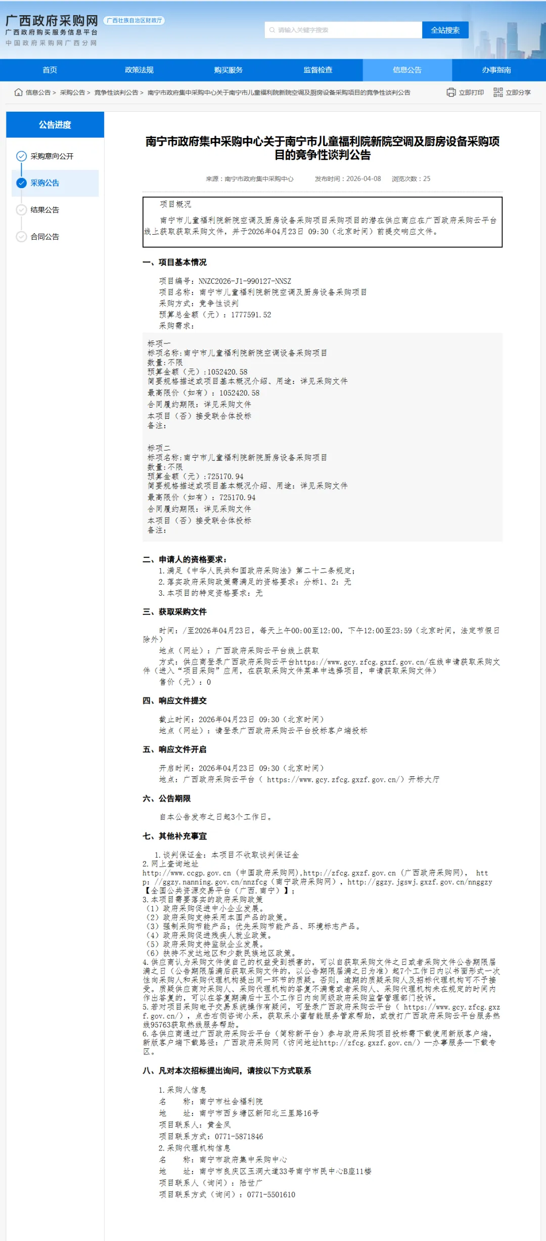>南宁市政府集中采购中心关于南宁市儿童福利院新院空调及厨房设备采购项目的竞争性谈判公告