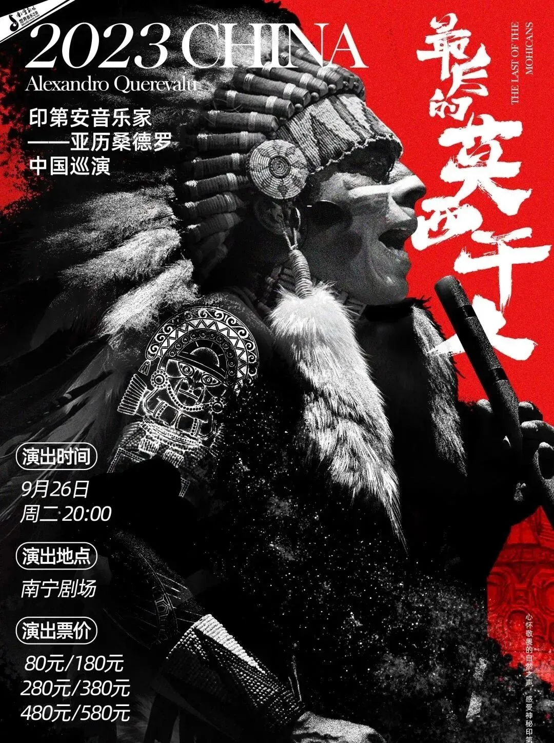9月26日 20:00 | 《最后的莫西干人》印第安音乐家亚历桑德罗专场音乐会 | 80/180/280/380/480/580元 | |