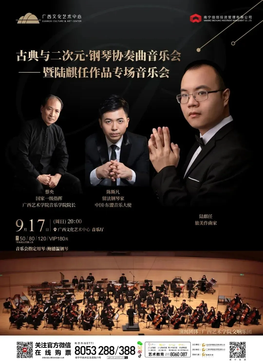 9月17日 20:00 | 经典与二次元·陈斯凡与广西艺术学院交响乐团钢琴协奏曲音乐会 ——暨陆麒任作品专场音乐会 | 50/80/120/180元 | |