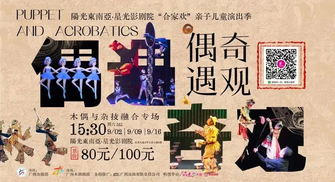 9月16日 15:30 | 木偶与杂技融合专场《偶遇奇观》 | 80/100元(文惠卡购票享9折优惠) | 广西文化惠 购票电话:19195659535 |
