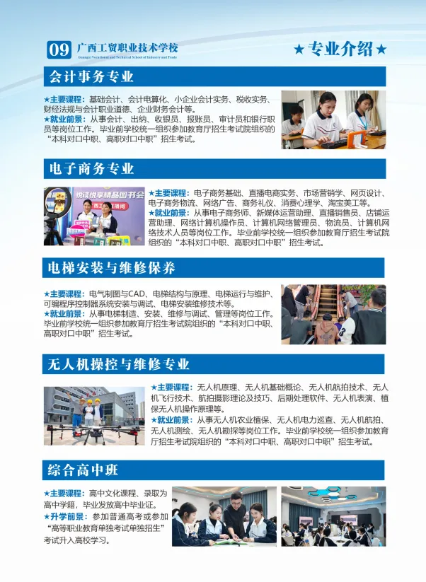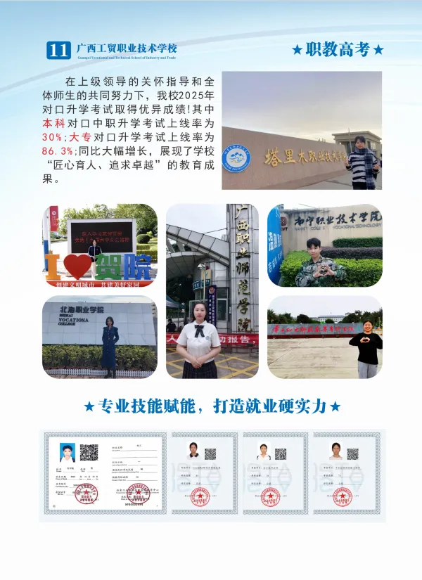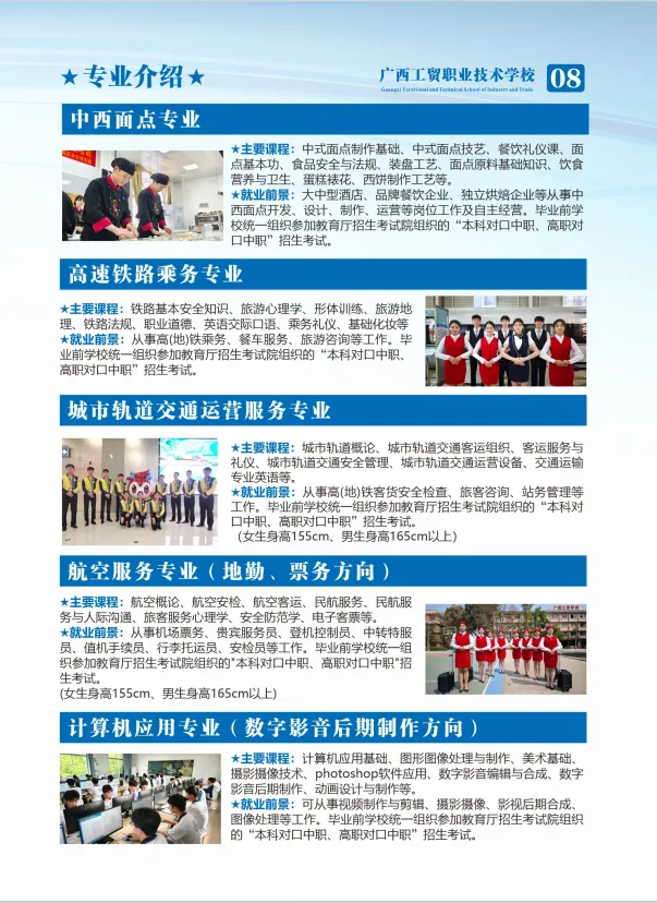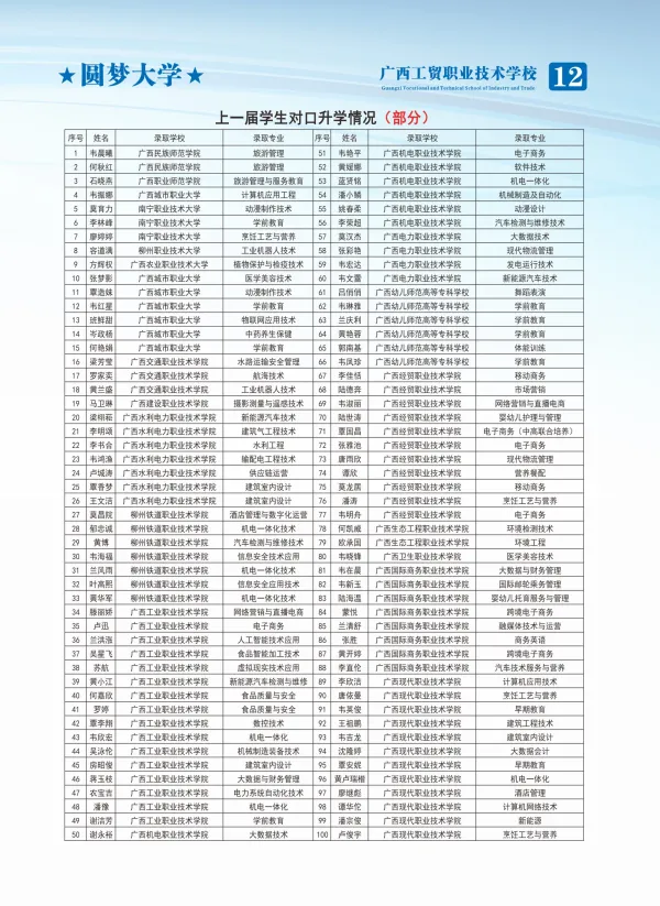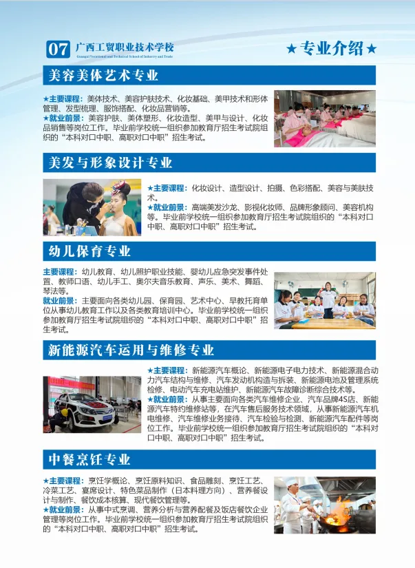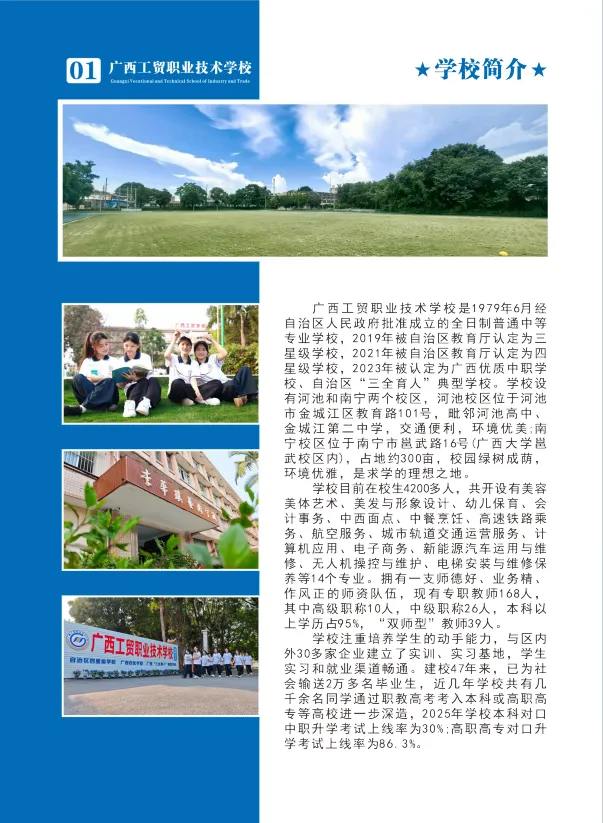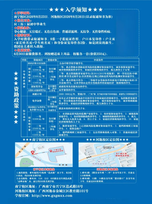 选公办·读工贸·好升学·好就业!广西工贸职校——四星级公办老牌名校,1979年建校,南宁河池双校区,中职三年免学费!热门专业全覆盖:计算机、电商、高铁乘务、新能源汽车、幼儿保育、美容形象、烹饪等,实训强、师资优。升学有保障:对口升学+职教高考,直通大专本科;就业有底气:校企订单培养,毕业推荐就业,就业率98%+。奖助完善、管理规范、校园温馨,让每一位学子技能立身、升学圆梦、就业无忧!