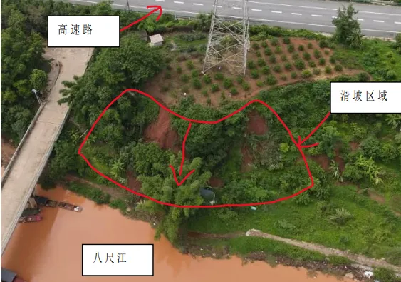 3.水文条件:坡脚临近八尺江,雨季地下水位升高,长期浸泡会显著软化岩土体;坡顶无常年地表水,仅存在降雨形成的临时径流。
