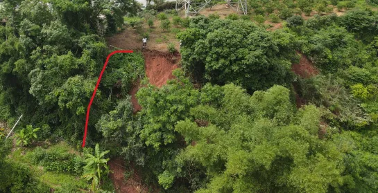 该500kV输电塔靠近八尺江,周边涉及乡村道路、农田及祭祀用地庙,车流量较大。近期塔基南侧斜坡突发滑塌,滑动面从坡脚贯穿至坡顶,形成“圈椅状”滑坡体。进入雨季,边坡易受渗水软化诱发二次滑坡,而该塔作为重要电力设施,塔基失稳可能带动前后档塔基连锁影响,造成重大经济损失与安全风险。接到紧急任务后,我单位第一时间组织专业技术团队进场,开展全面勘查与风险评估,为紧急整治提供技术支撑。
