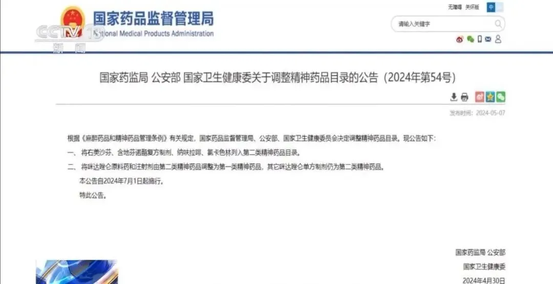 2024年5月7日,国家药监局、公安部、国家卫生健康委发布公告,根据《麻醉药品和精神药品管理条例》将右美沙芬列入第二类精神药品目录,并自2024年7月1日起实施。