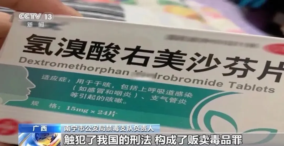 南宁市公安局禁毒支队民警:“这个主要犯罪嫌疑人韦某,在售卖右美沙芬的时候,她为了规避公安机关的打击,首先是将出售的右美沙芬片的外包装用一些其他的盒子、药盒来伪装。第二个,她是只卖熟人,第三个特点,她会在线上来跟购买人员联系,然后通过线下用同城快送的方式,来将右美沙芬送至这个购买人员的手中。”