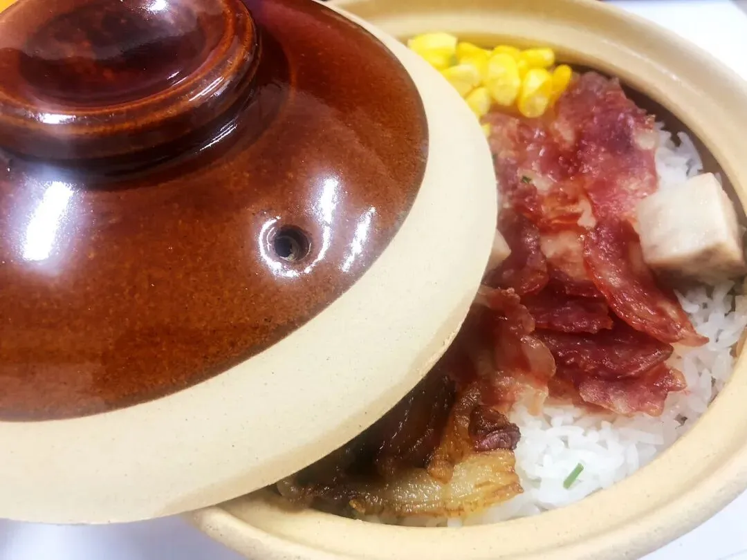 我点的是广式腊肠煲仔饭,我拿到时砂锅还烫手,揭开盖子,腊味的香气扑面而来。腊肉腊肠肥瘦相间,米饭粒粒分明,油脂渗进米饭里,每一口都是满足。
