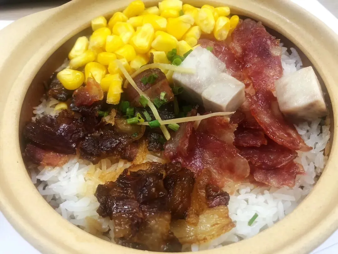煲仔饭底部还结了一层金黄的锅巴,脆而不焦,嚼起来特别香,还配有玉米粒和芋头,解腻又清爽。独立包装的酱油,按自己口味调放。