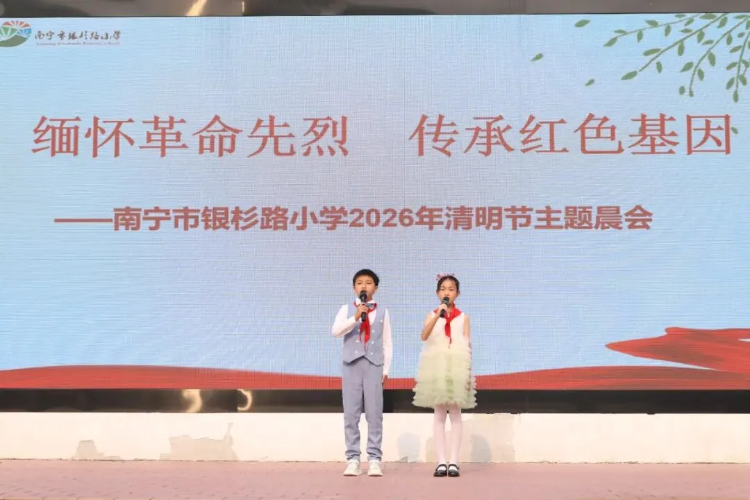 清明时节,为深切缅怀革命先烈,传承红色基因,厚植师生爱国情怀,南宁市银杉路小学于4月3日清晨隆重举行了“缅怀革命先烈 传承红色基因”清明节主题晨会。