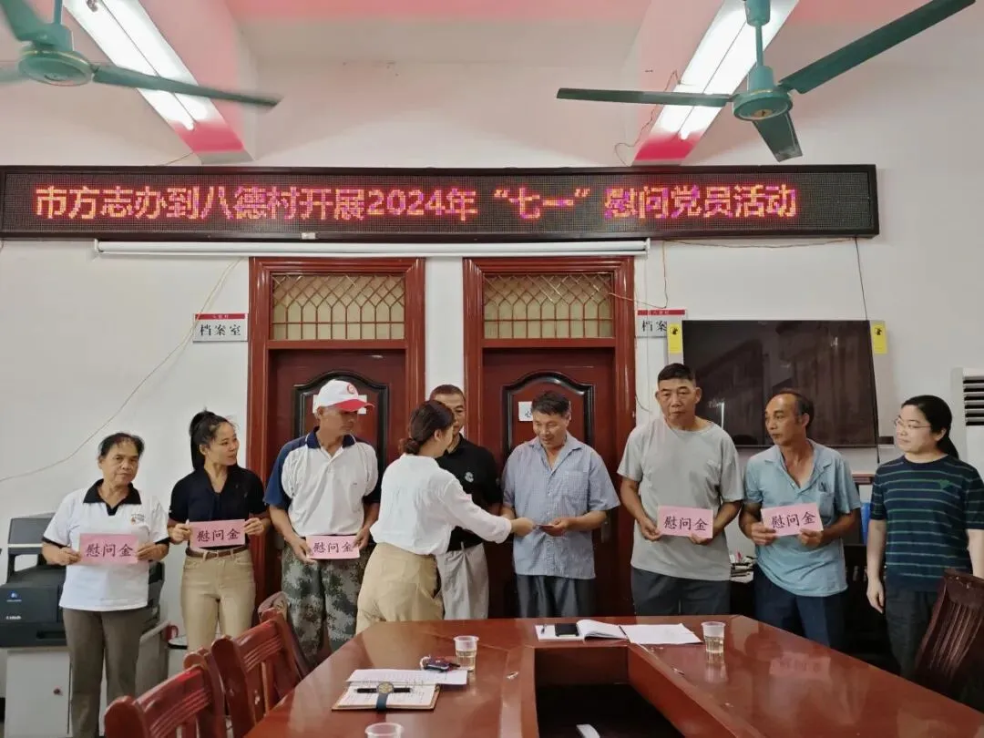 活动中,市方志办党员干部向八德村的困难党员、老党员、优秀党员等送上“七一”慰问祝福,感谢他们为家乡乡村振兴作出的贡献,鼓励他们要进一步发挥党员先锋模范作用,带领村民增收致富。随后,市方志办党员干部与八德村“两委”干部、驻村第一书记、党员代表进行座谈,就八德村村级集体经济发展、巩固拓展脱贫攻坚成果同乡村振兴有效衔接考评反馈问题整改进行研究、指导。