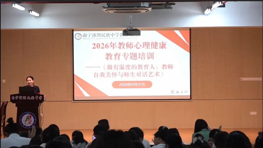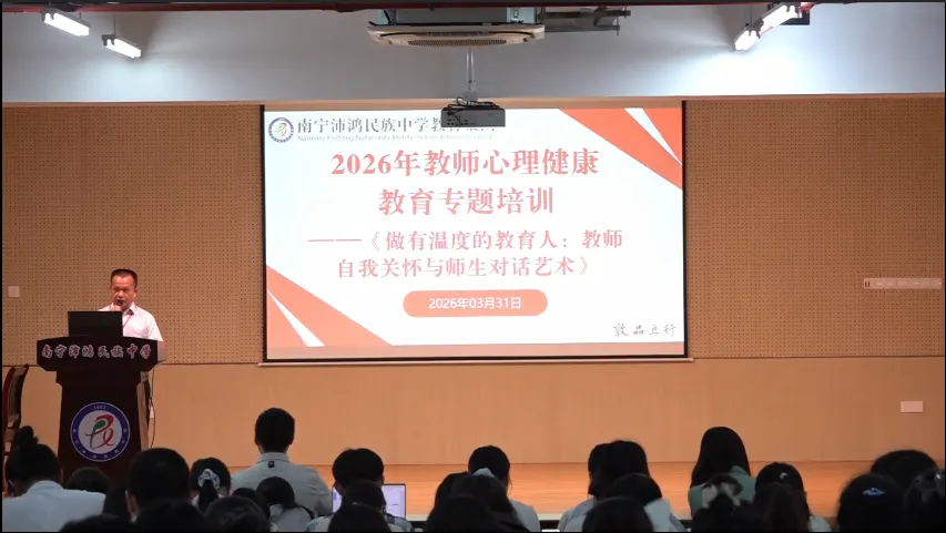 教师的心理健康是教育事业发展的重要基石,也是实现高质量育人目标的关键保障。为帮助教师有效应对职业压力,提升心理调适能力,营造温暖和谐的工作氛围,2026年3月31日,南宁沛鸿民族中学同乐校区科研处组织开展主题为《做有温度的教育人——教师自我关怀与师生对话艺术》的心理减压专题培训活动。本次活动由科研处李杨杰副主任主持,南宁沛鸿民族中学教育集团同乐校区黄宗福副校长、李忠副校长、各处室中层领导以及绿萝心数团队的玉亮老师和高菲老师出席活动。