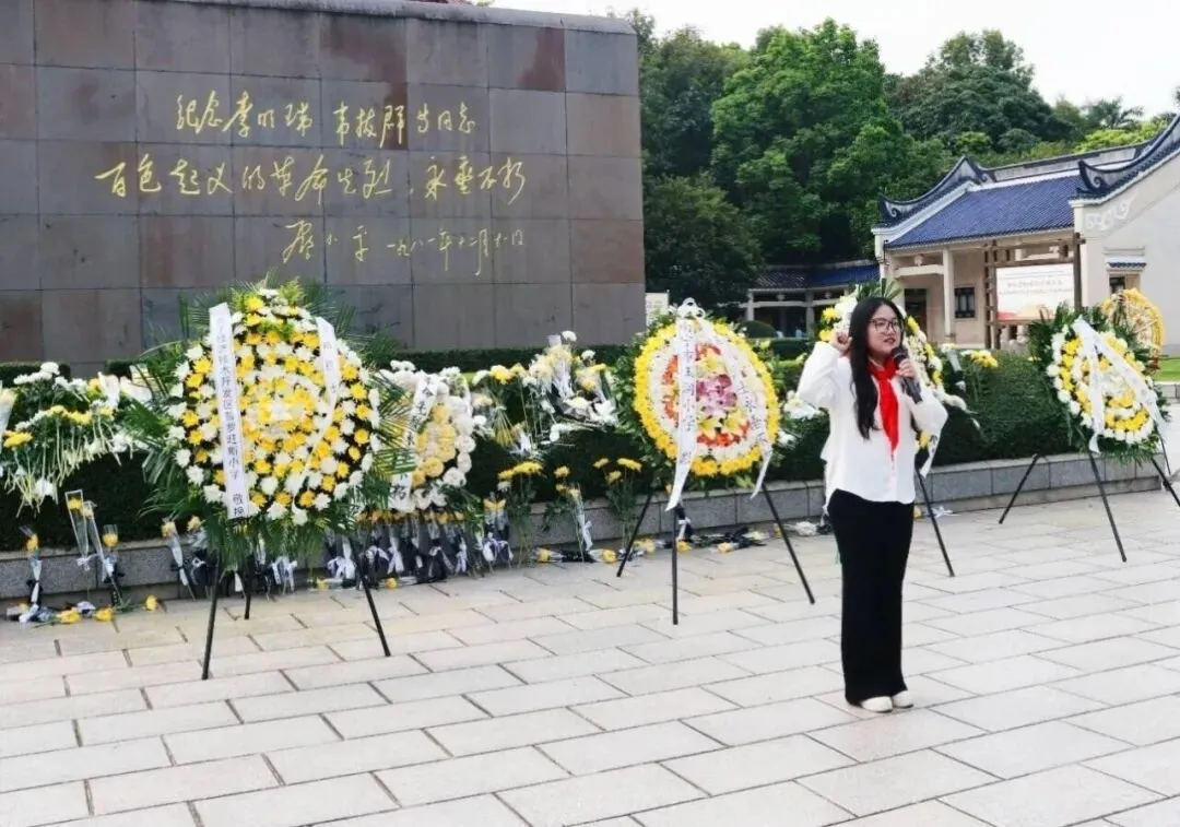 党员教师代表刘庆、杨诗夏向革命烈士敬献花圈,张丽霞副校长仔细整理花圈缎带与挽联,以庄重仪式寄托无限追思。