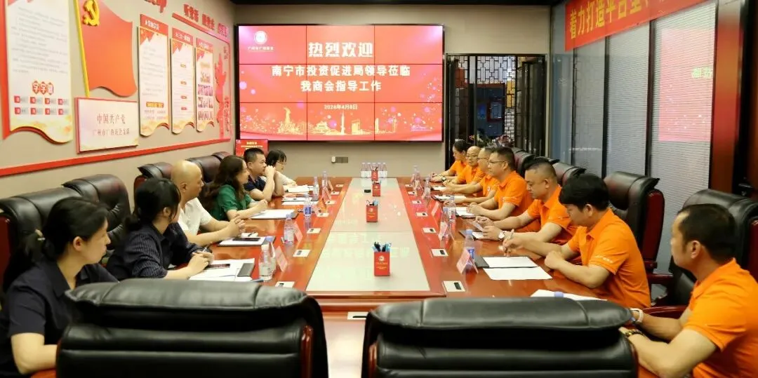 2026年4月8日,南宁市投资促进局副局长张梅率队一行6人专程到访广州市广西商会,围绕南宁市2026年招商引资重点工作、中国—东盟产业合作区南宁片区(粤港澳大湾区)推介活动筹备事宜,与商会开展深度座谈交流。广州市广西商会副会长兼值班会长农会荣、雷秀运,秘书长谭栋元,执行秘书长朱红荣,会员韩旭坡、容上云、曾庆辉等值班人员热情接待,双方以桑梓情谊为纽带,聚焦平陆运河建设、人工智能、低空经济、新能源、新材料等核心产业,共叙乡情、共商合作、共促家乡高质量发展。