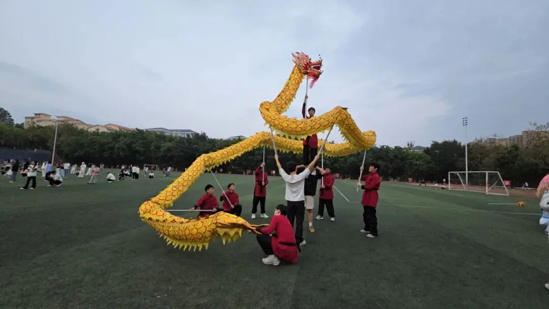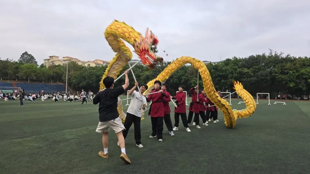 在排练现场,忠仁龙狮团队员精神饱满、配合默契,伴随着铿锵节奏,流畅完成起势、盘旋、跳跃、游龙等一系列动作。队员们队形整齐、气势昂扬,长龙翻腾游走间,尽显当代青年学子的朝气与活力。