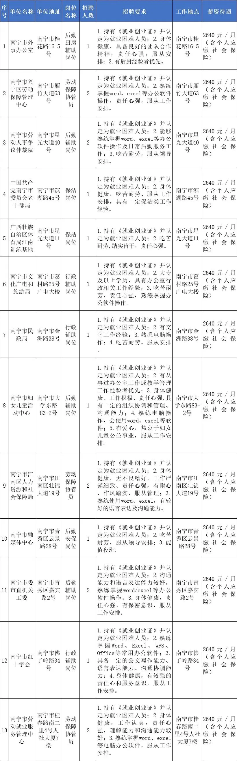 第一步:公开发布招聘岗位信息。人社部门每月向用人单位收集岗位信息并通过南宁市人力资源和社会保障局网站(http://rsj.nanning.gov.cn/)、南宁人社微信公众号等方式向社会公开发布公益性岗位信息及专场招聘会时间;