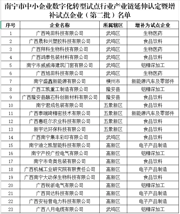 为加快实施中小企业数字化转型试点城市建设,根据《关于组织申报2025年中小企业数字化转型(补助类)项目的通知》(南工信信发〔2025〕2号)和《关于组织召开南宁市中小企业数字化转型试点行业产业链延伸认定暨增补试点企业评审会的通知》要求,经县(市、区)、开发区初审上报、专家评审,形成了南宁市中小企业数字化转型试点行业产业链延伸认定暨增补试点企业(第二批)名单。现向社会公示,公示期5日。