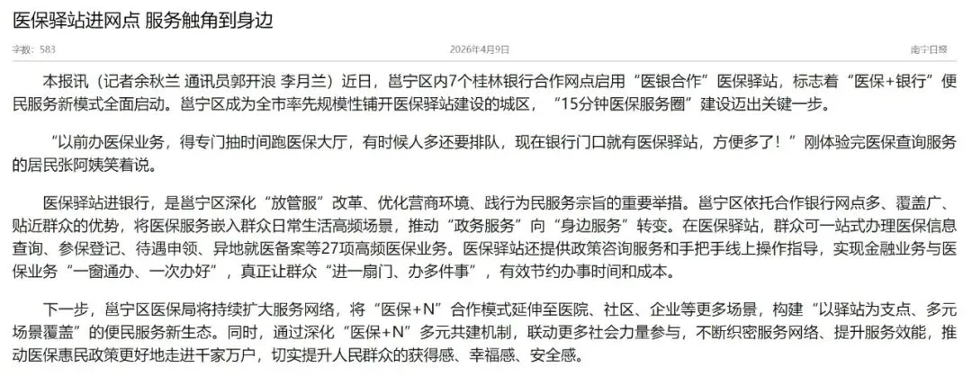 >南宁日报报道 | 医保驿站进网点 服务触角到身边