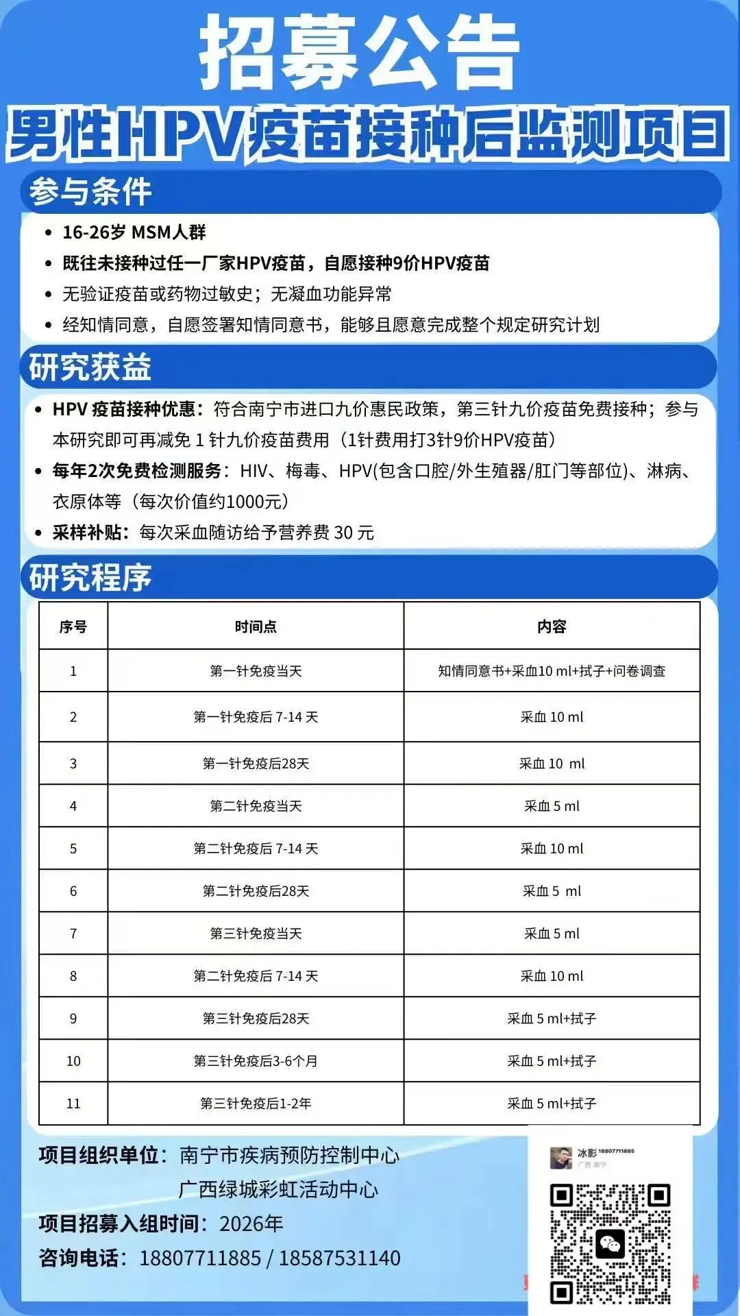 HPV疫苗接种优惠:符合南宁市进口九价惠民政策,第三针九价疫苗免费接种;参与