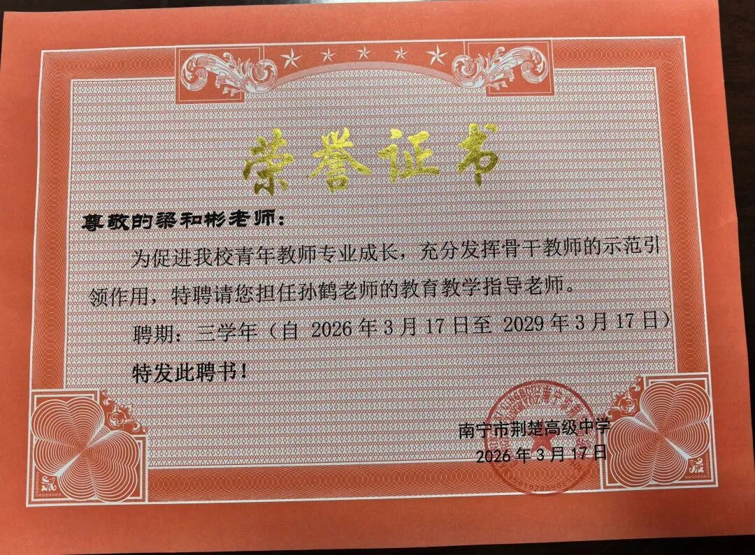 为打造一支师德高尚、业务精湛、可持续发展的高素质教师队伍,进一步弘扬我校“传、帮、带”的优良传统,助力青年教师快速成长,全面推动教学质量再上新台阶,2026年3月31日,南宁市荆楚高级中学隆重举行青蓝工程师徒结对仪式。