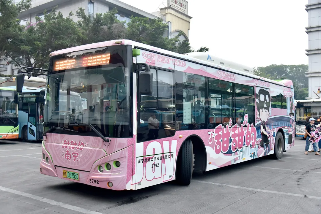 随机出现在南宁各公交线路。粉色车身印着Q版“周同学”形象和“甜甜的南宁”等字样,车厢座椅、扶手贴有“周同学”贴纸,成为邕城街头一道灵动的风景。