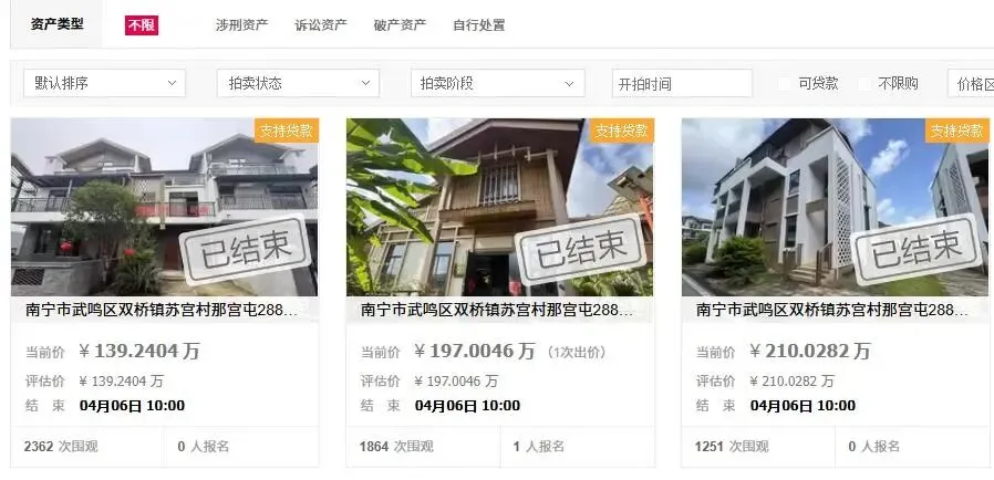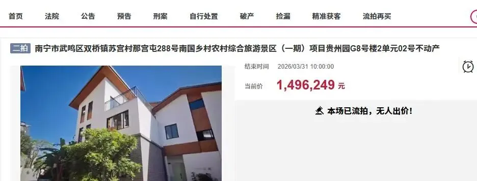 而在同一天,这个南国乡村农村综合旅游景区还有另外两栋别墅也是同时被拍卖的,一栋建筑面积为341.88平方米,起拍价210万元起;一栋建筑面积为215.86平方米,起拍价139万元。两栋别墅不知道是不是毛坯房的原因,最终都没有人报名竞拍而流拍了。