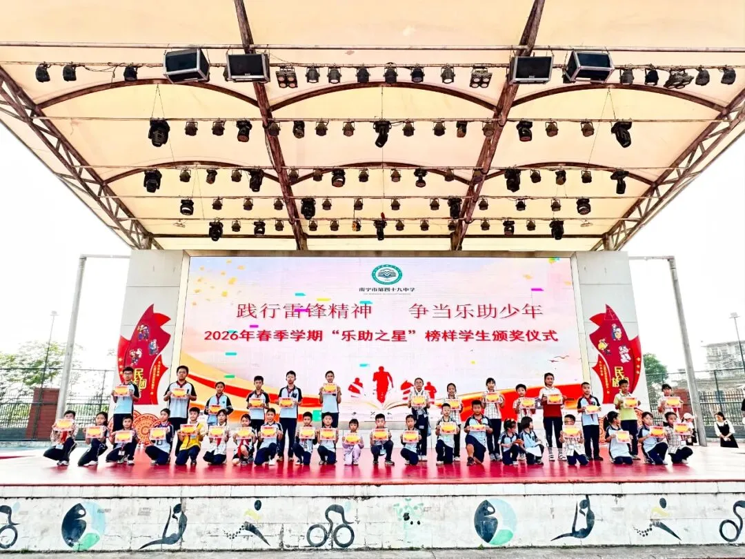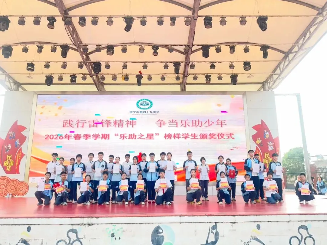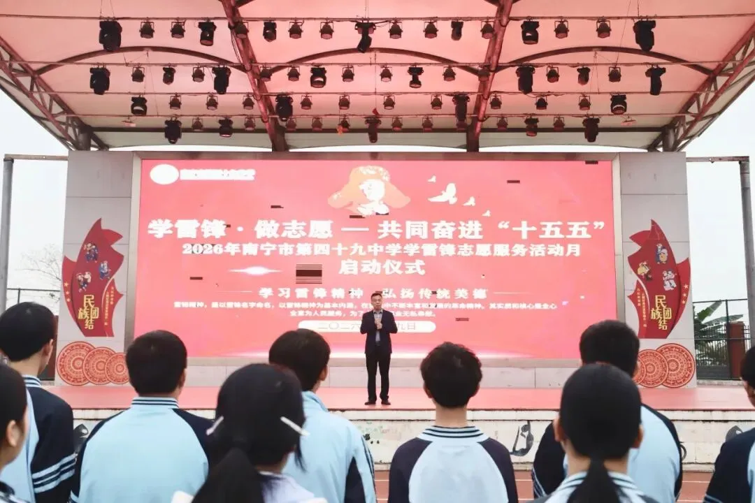 三月春风润校园,雷锋精神融入青春血脉,在校园里薪火相传、枝繁叶茂。南宁市第四十九中学以“学雷锋·做志愿——共同奋进‘十五五’”为主题,开启2026年学雷锋志愿服务活动月,师生们用一场场暖心行动,让“奉献、友爱、互助、进步”的志愿精神深深扎根心间。