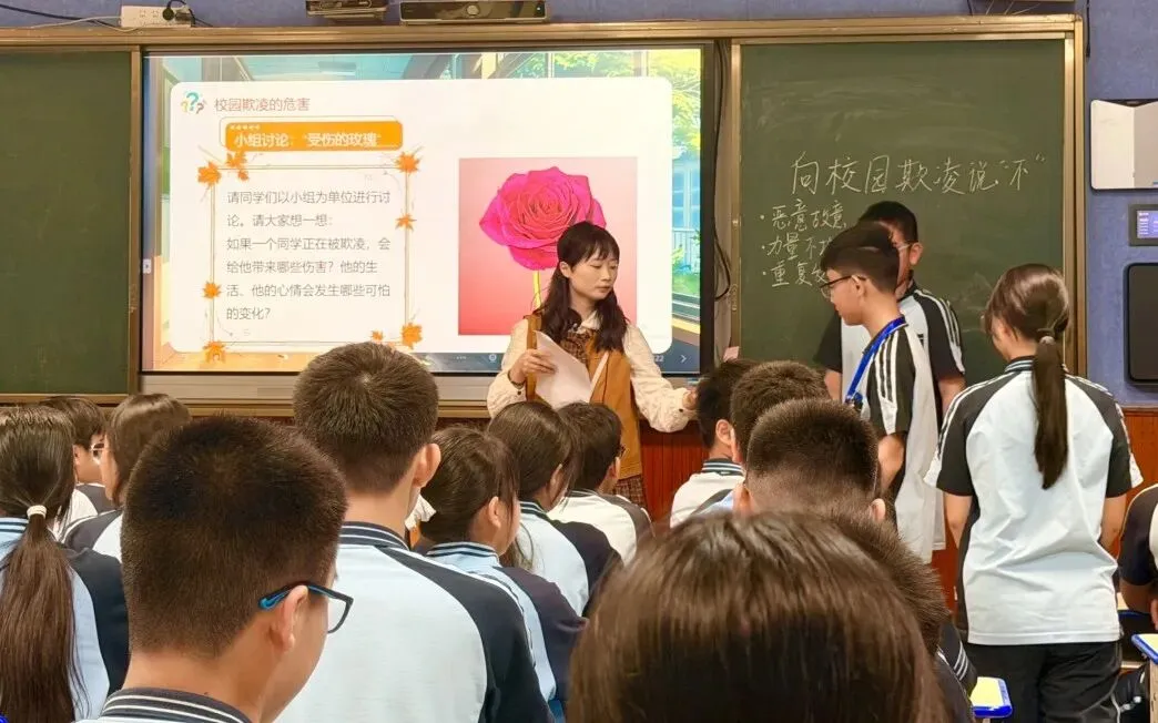 唐淑权、吕美漫、吴玲秀、蒙玉妹四位老师聚焦防校园欺凌,通过案例剖析、情景模拟等形式,教会学生辨别欺凌、保护自己,共建和谐班级。