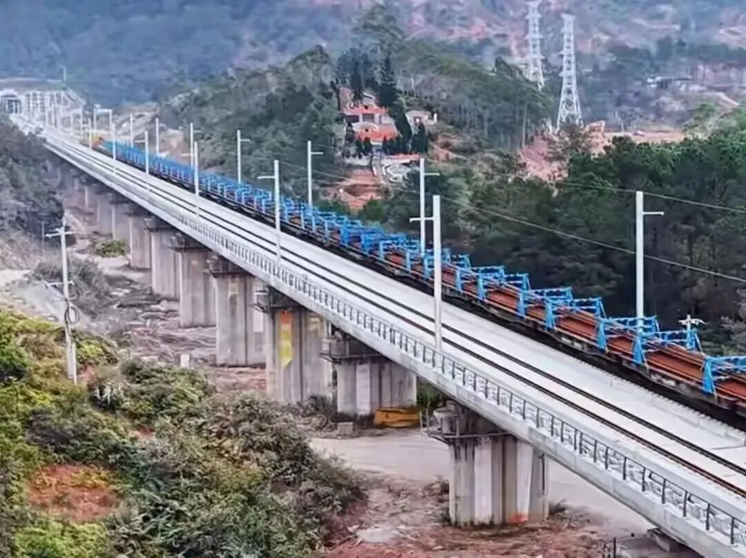 线路全长84.9公里,桥隧比高达84.4%(含22座隧道、65座桥梁),线下路基、桥梁、隧道已100%完工。2026年2月完成全线铺轨,目前正推进轨道精调与站房施工: