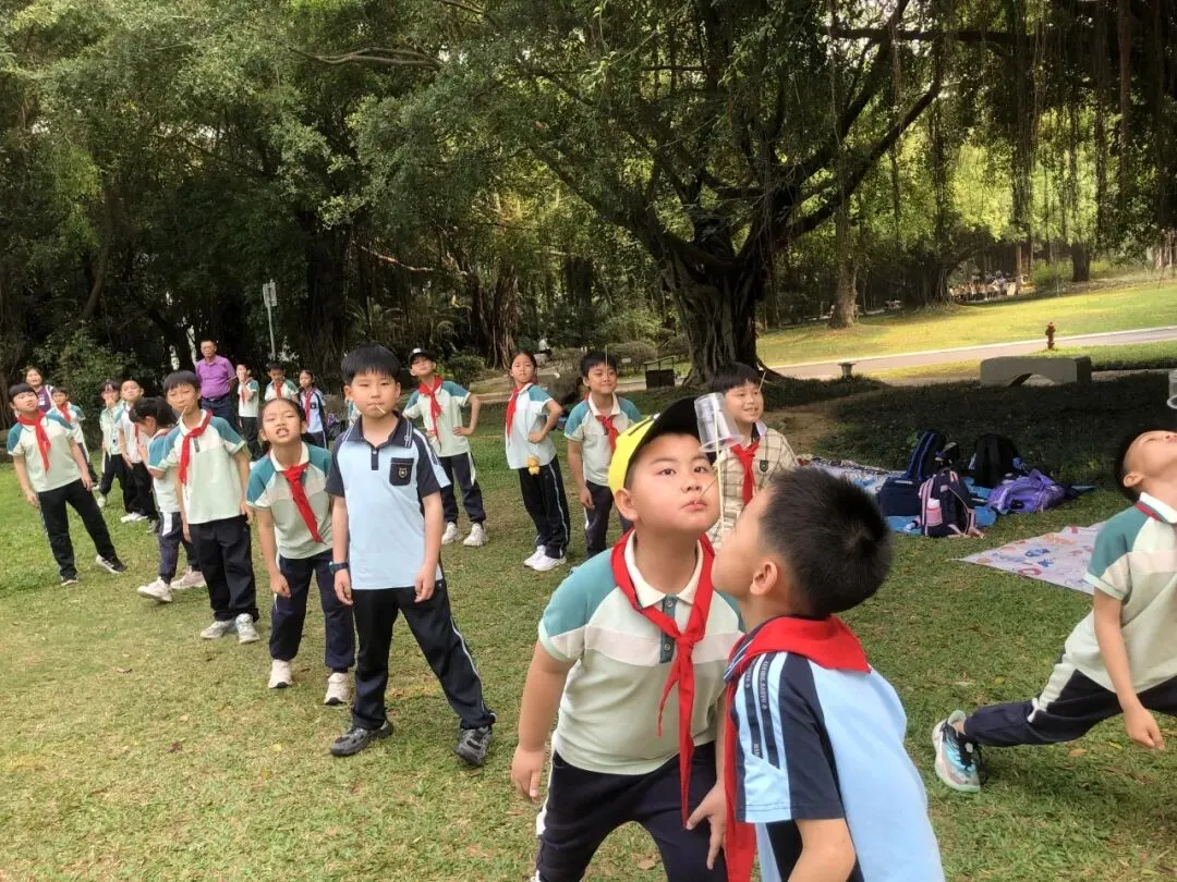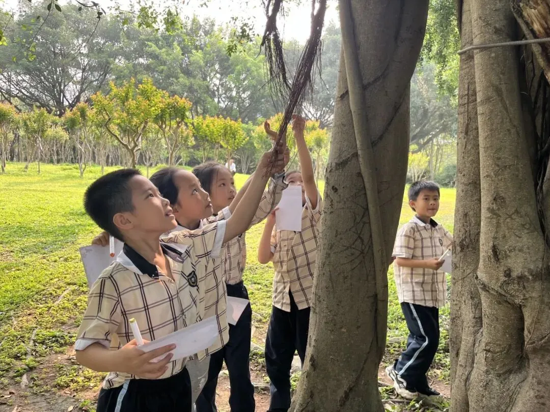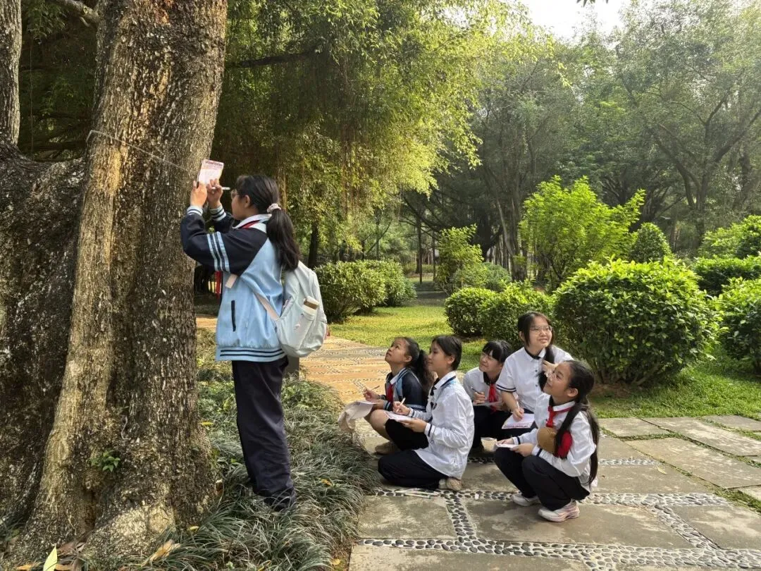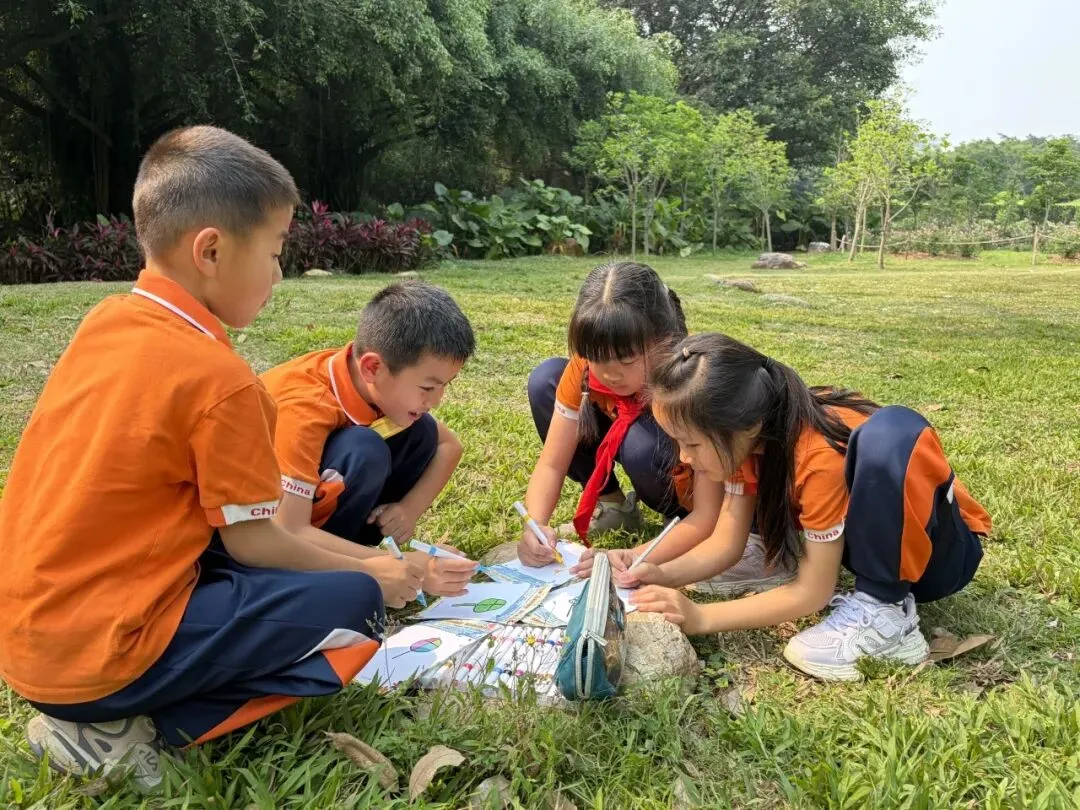 春日南湖,草长莺飞、繁花似锦,湖畔杨柳依依、草木葱茏,处处洋溢着生机与活力。低年级学生化身“自然小观察员”,在老师的引导下漫步林间草地,认真观察榕树、木棉树、三叶草等植物的叶片形态,仔细分辨形状、颜色与纹理。孩子们捡拾别致落叶、细看嫩叶脉络,用画笔勾勒叶片模样,用童真语言写下春日感悟,在观察与表达中感受自然之美。