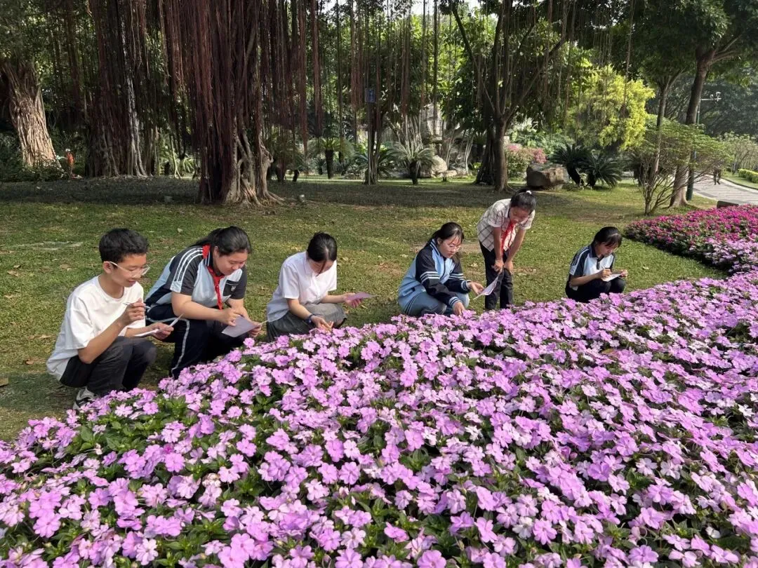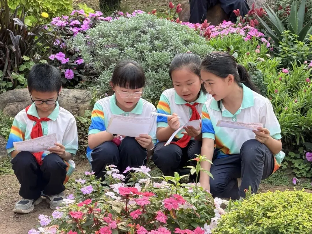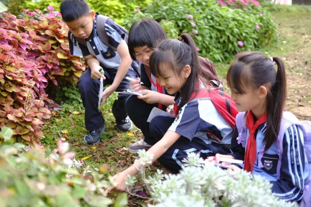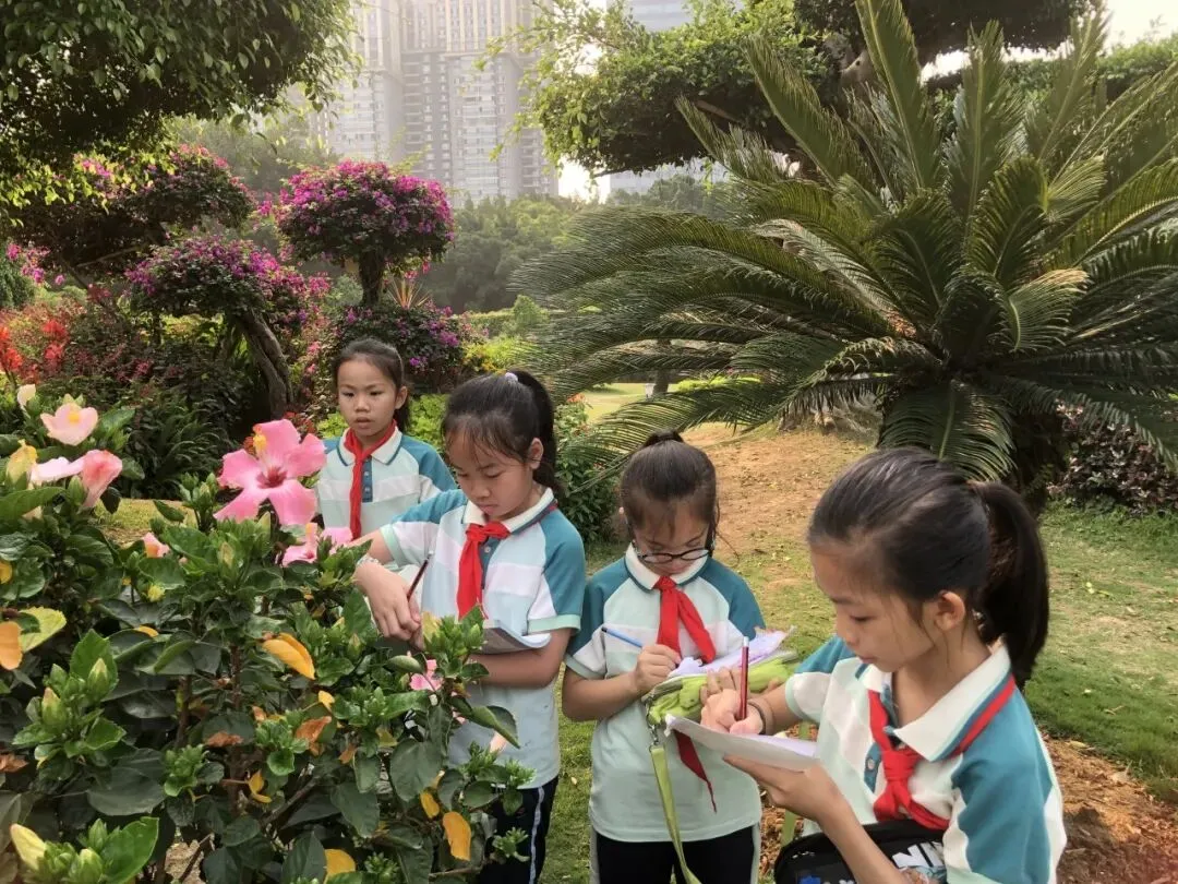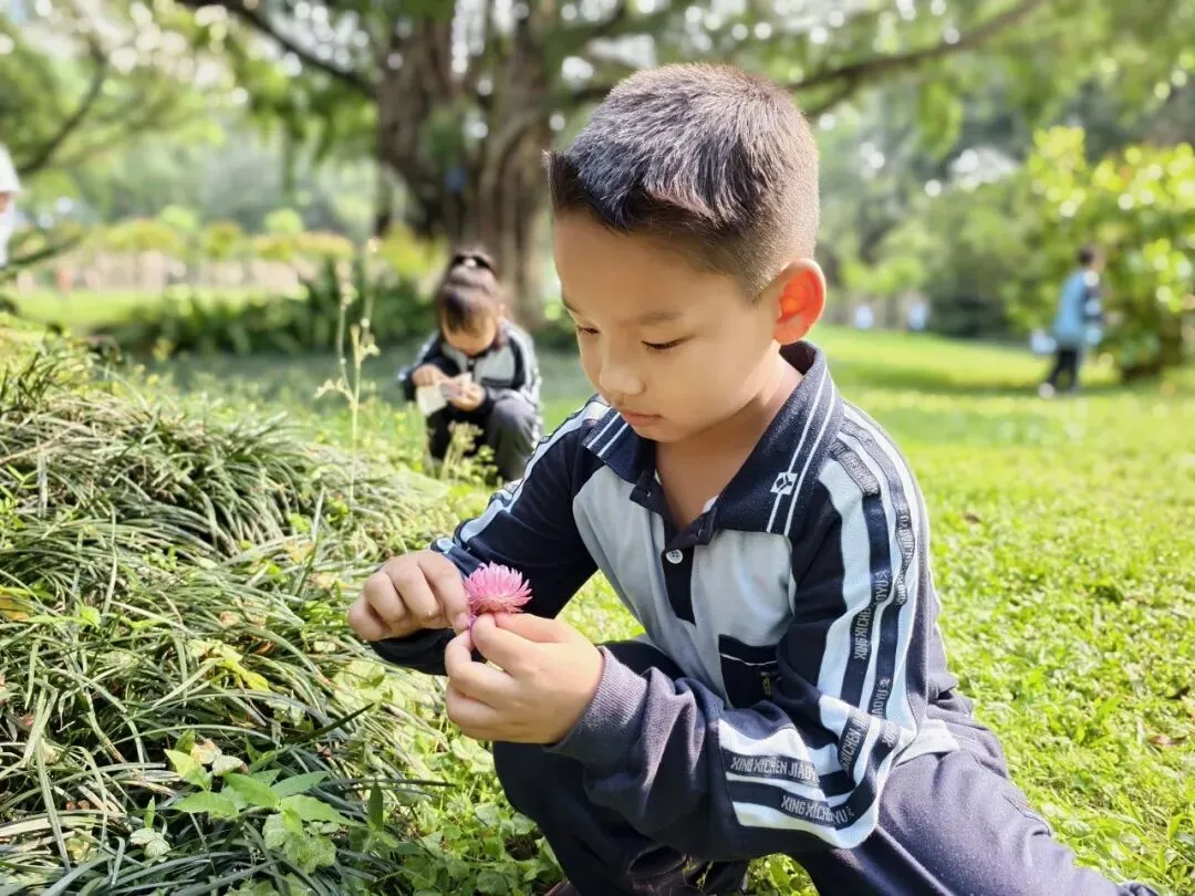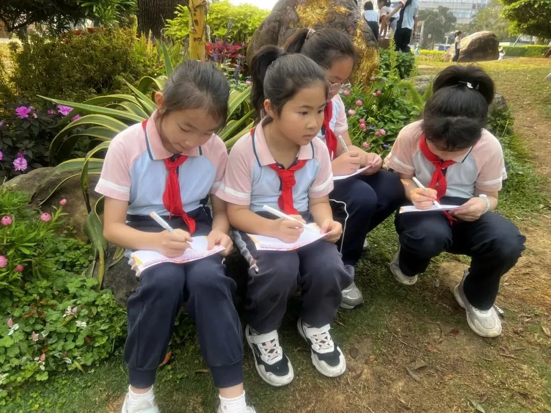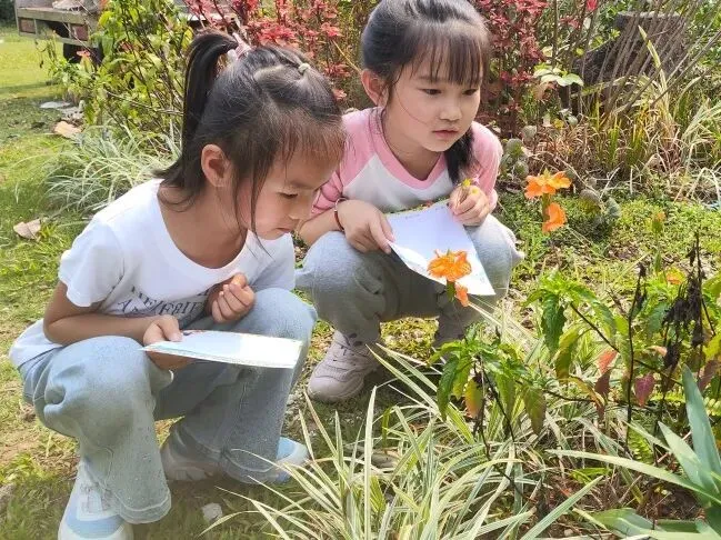 中高年级学生聚焦“药香”主题,化身“植物小记录员”,细心辨识公园特色植物,记录名称、外形、颜色与生长环境,为朱槿、三角梅、莲花、麦秆菊等制作专属研学名片。孩子们或驻足端详草木形态,或结伴探讨生长习性,或俯身记录研学心得,把自然观察与知识学习融为一体。在亲手制作、实地探寻中,他们读懂植物特性、感知自然奥秘,于潜移默化间浸润传统植物知识。