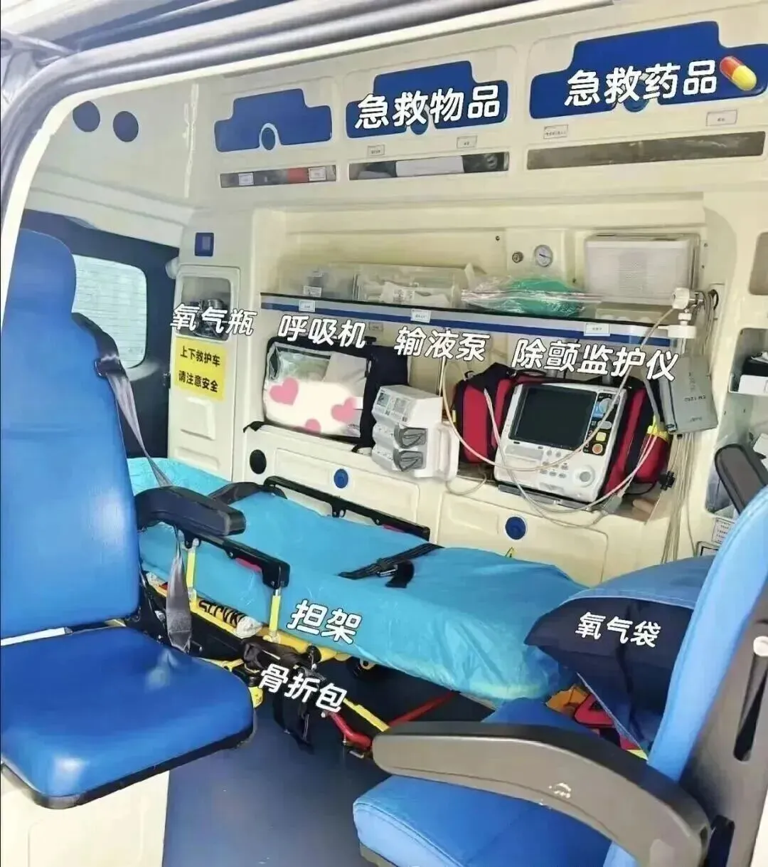 专业医用担架床、可调节吸氧装置、稳固输液架、防滑缓冲床垫、独立分区空调,确保转运平稳舒适。
