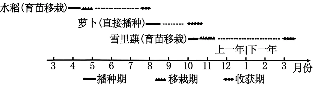 近年来,浙江省创新推广“早稻—萝卜—雪里蕻”轮作模式。该模式通过合理安排种植时间,实现一年三熟,较传统“单季晚稻—油菜”模式提高了农户的经济收入和水稻种植积极性。如图示意该种植模式的农事安排。据此完成下面小题。