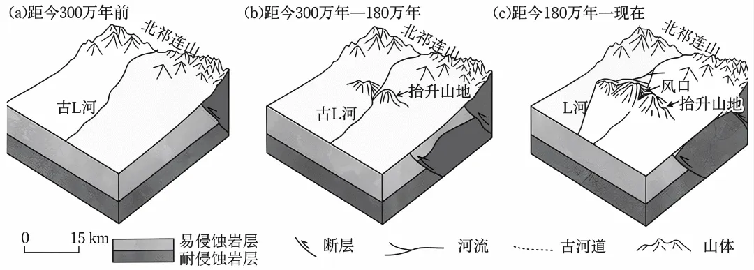 发源于北祁连山的L河在山地抬升与河流下切的共同作用下,先后经历了流向维持、流向偏转的水系演变过程。L河发生转向后,在抬升山地的废弃河道处形成“风口”。如图示意L河的演变过程。据此完成下面小题。