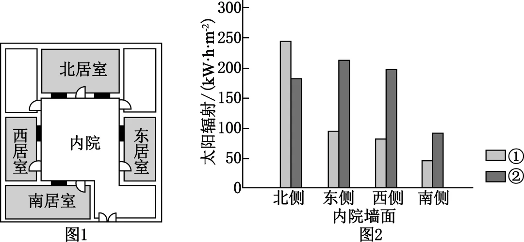 我国西北某乡村村民在长期适应自然环境的过程中,形成了独特的民居“遮用阳”经验:通过设置不同方位屋檐的长度,实现夏季遮阳、冬季采光的效果。图1示意该地民居常见的“院落式”布局,图2示意该地某院落内院不同方向墙面冬、夏季单位面积接收的太阳辐射量。据此完成下面小题。