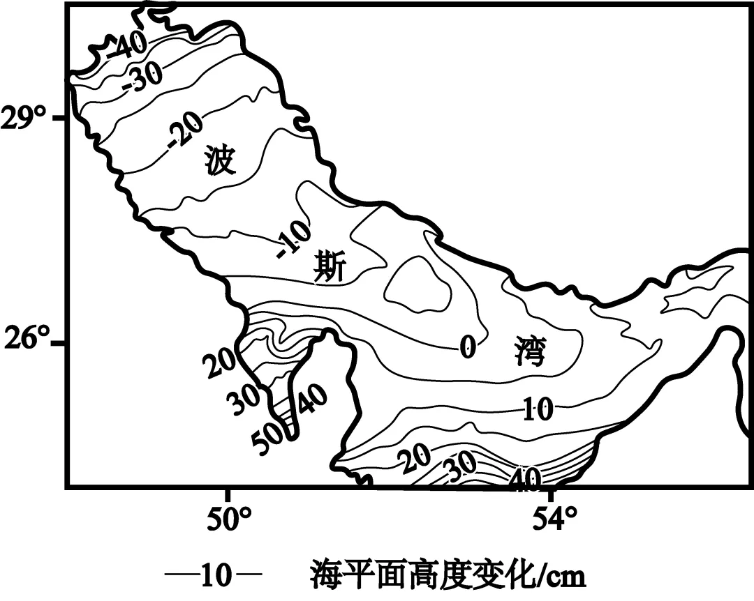 波斯湾为半封闭海域,平均水深约35m。某年11月下旬,该海域出现一次持续4~5天的地方性强风天气——“夏马风”,造成表层海水降温(局部降幅达10℃)及海平面高度变化(如图)。据此完成下面小题。
