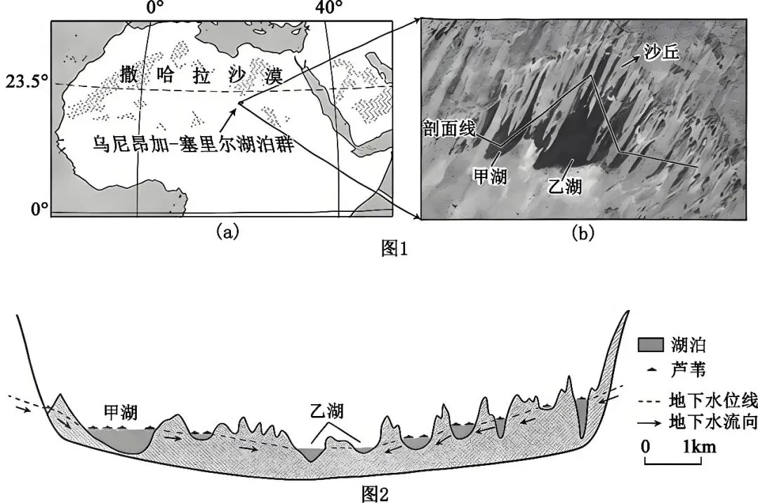 乌尼昂加-塞里尔湖泊群位于撒哈拉沙漠腹地,其前身是1.5万至5000年前湿润时期的乌尼昂加古湖,后因气候转干,古湖受风沙影响被隔离成多个独立湖泊。该湖区年均降水量不足25mm,潜在蒸发量高达6000mm。湖泊群部分湖面被厚厚的漂浮芦苇覆盖。图1示意该湖泊群的位置与形态,图2为湖泊群剖面示意图,甲湖与乙湖盐度差异显著。