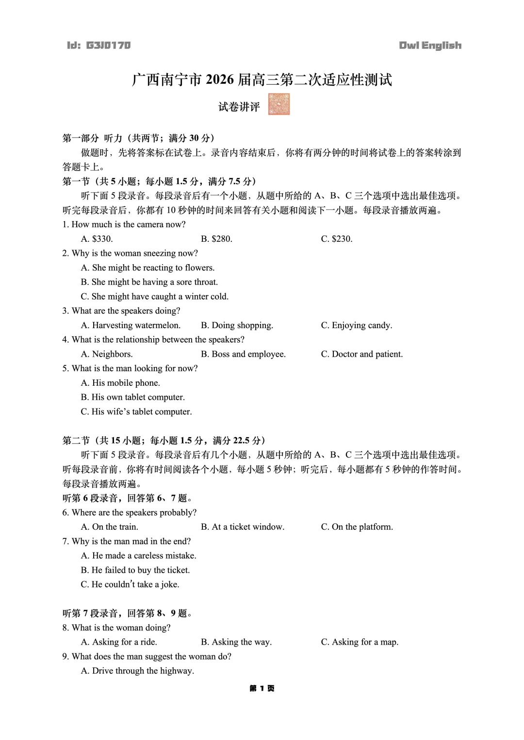 >广西南宁市2026届高三第二次适应性测试