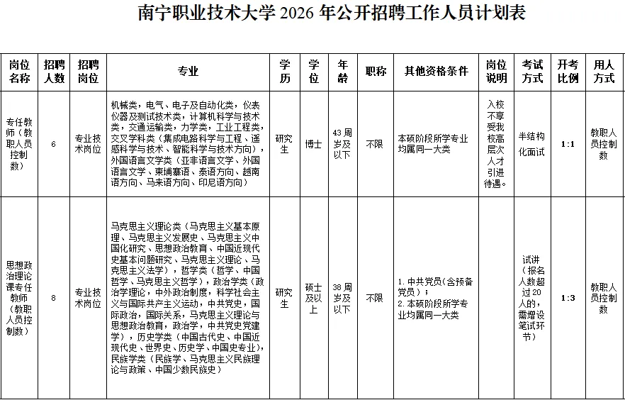附件:1.南宁职业技术大学2026年公开招聘工作人员计划表