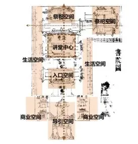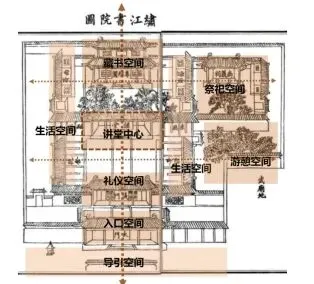 书院牌坊也称棂星门,一般竖立大型书院建筑前面,临近路口,提醒人们进入严肃恭敬的地域,多有品题刻在牌坊。书院除了具备讲学功能之外兼有学术交往、生活起居,游憩、仓储等功能,也有如钦州东坡书院石牌坊与书院大门之间有膏火铺和铺面,以出租铺面来为书院提供膏火(书院每月发给肄业生徒的生活费用),维持书院日常运作。讲堂是整个书院的中心,讲堂前的院落多开敞且面积最大,每到讲学辩论之时能扩展面积,营造自由开放的学习空间。“顾书院之建,必崇祀先贤,以正学统”,祭祀空间是儒家“礼”文化必不可少的内容,占据书院中最为恢宏威严,放置在讲堂之后显示其尊崇的地位。
