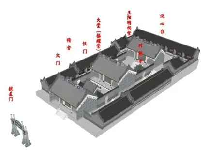 南宁敷文书院建筑的文献记录寥寥无几,从《南宁府志》(1538)和《左江道修复王文成公敷文书院碑》(1583)记载,书院建筑布局在明朝时期有过三次变化,从创建初期的二进中轴对称合院式布局演变为三进中轴合院式布局。书院建筑坐北朝南,沿着中轴线依次是大门、正厅(讲堂)、后厅、田塘,东西建有廊房供生活起居。明嘉靖十六年(1537),知府郭楠对学院进行修整时,阳明心学已经在学子中风靡一时,新立王阳明像,后厅为文成公祠。明万历十一年(1583)的修复,敷文书院建筑布局从二进合院拓展为三进合院,沿着中轴线依次是大门(敷文书院匾额)、仪门、讲堂、后堂(道德功勋匾额)、多列房屋,东西18间精舍作为生活起居用房。在第三进的末端,后堂空间抬升,后堂院内的“对越亭”、王阳明石像和三进院内洗心台是此次增加新内容(图3)。