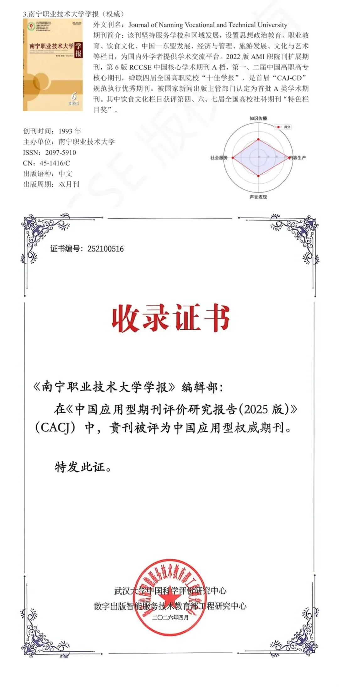 日前,由武汉大学中国科学评价研究中心、数字出版智能服务技术教育部工程研究中心联合开展的2025版应用型期刊评价工作顺利完成。《中国应用型期刊评价研究报告(2025版)》正式发布,《南宁职业技术大学学报》入选社会科学综合应用(高职高专学报类)权威期刊,此次已经是第二次入选。