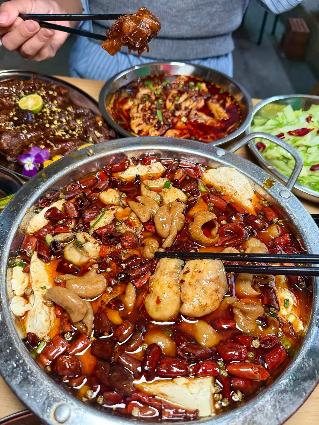 3. 老友红油大肠 你要是爱重口味,还有更厉害的。满盆红油浸泡着大肠和嫩豆腐。那是真正的老友味,酸辣鲜香。
