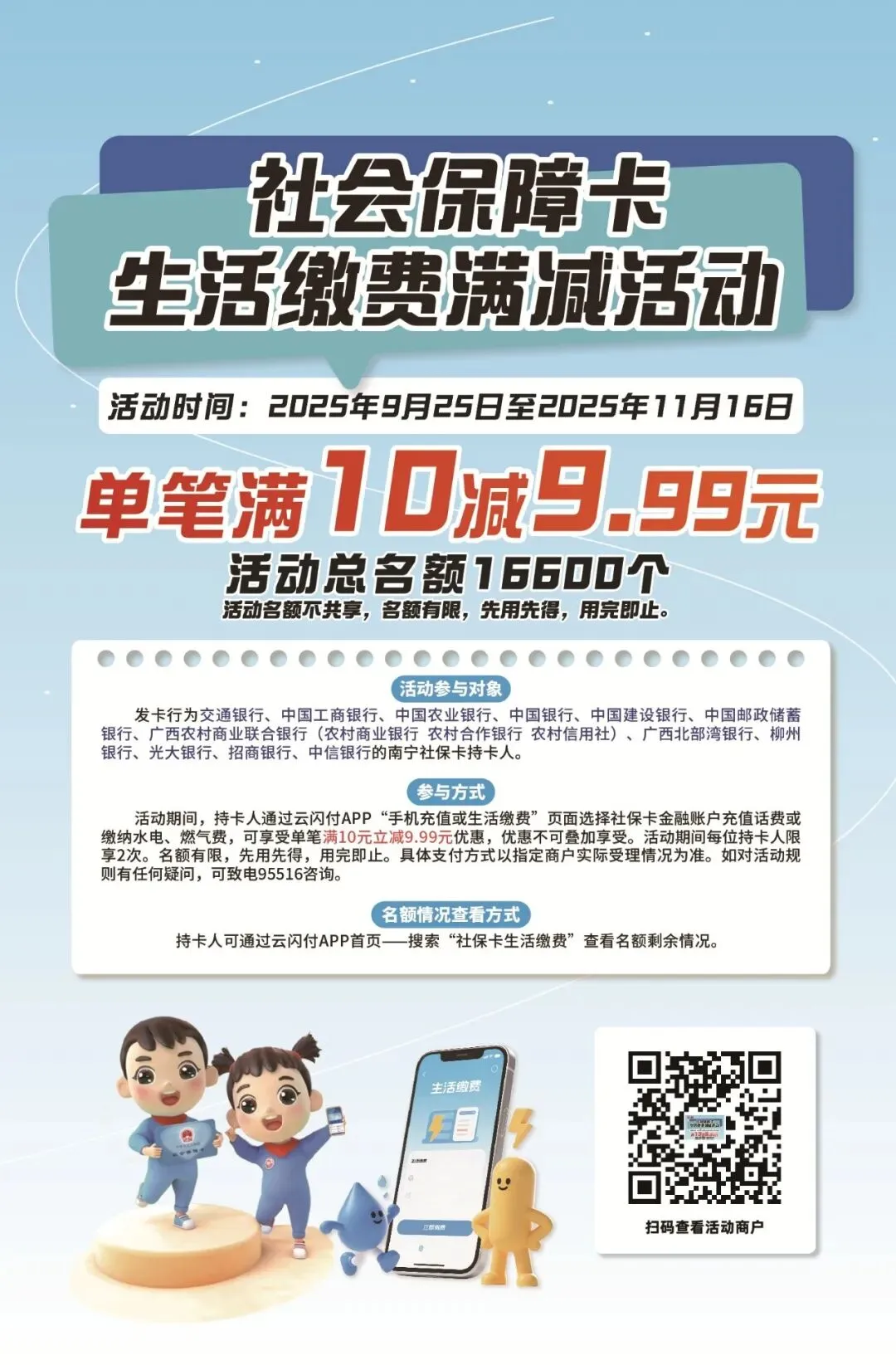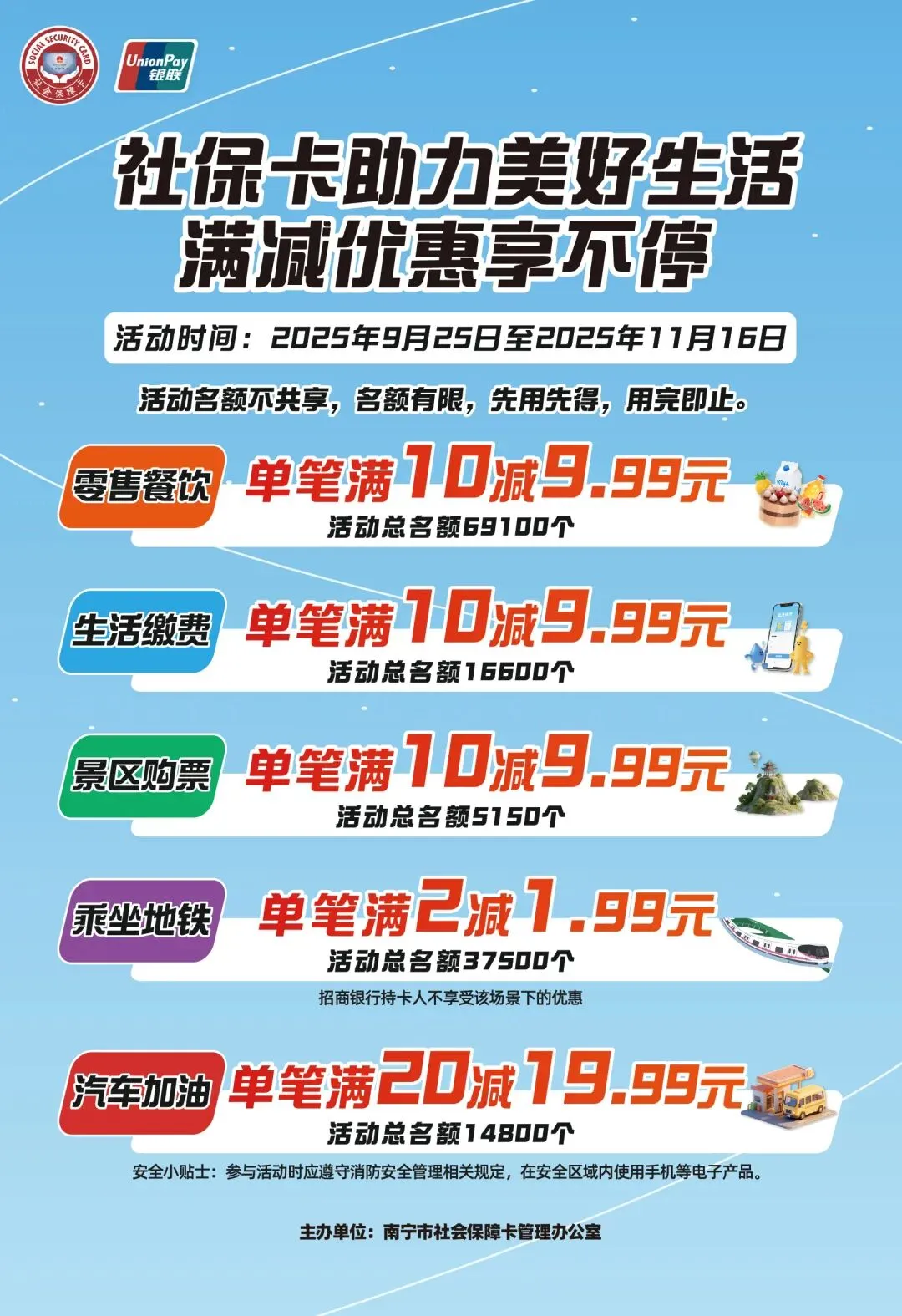 9月25日起,南宁市社会保障卡管理办公室联合交通银行、中国工商银行、中国农业银行、中国银行、中国建设银行、中国邮政储蓄银行、广西农村商业联合银行(农村商业银行 农村合作银行 农村信用社)、广西北部湾银行、柳州银行、光大银行、招商银行、中信银行共12家社保卡合作银行,在全市开展“社保卡助力美好生活,满减优惠享不停”活动。