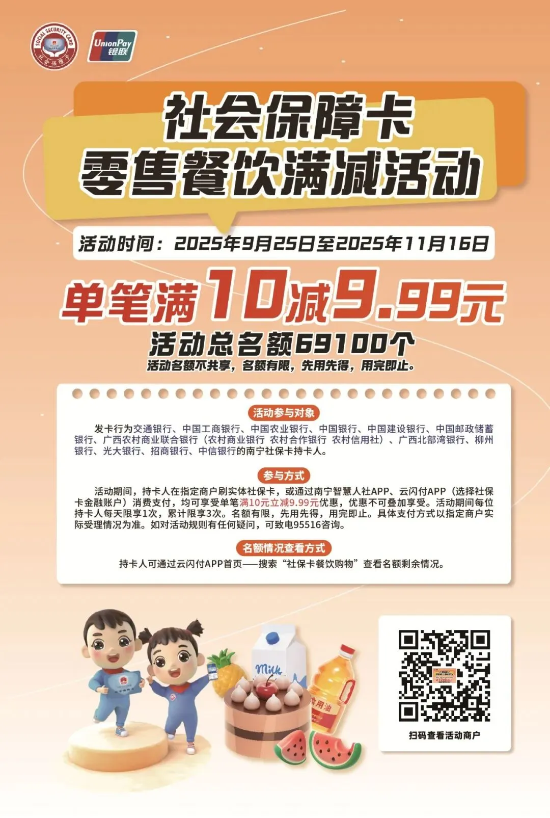 活动期间,持卡人在指定商户刷实体社保卡,或通过南宁智慧人社APP、云闪付APP绑定社保卡金融账户消费支付,均可享受单笔满10元立减9.99元优惠,优惠不可叠加享受。活动名额共69100个,活动期间每位持卡人每天限享1次,累计可享3次。名额有限,先用先得,用完即止。具体支付方式以指定商户实际受理情况为准。