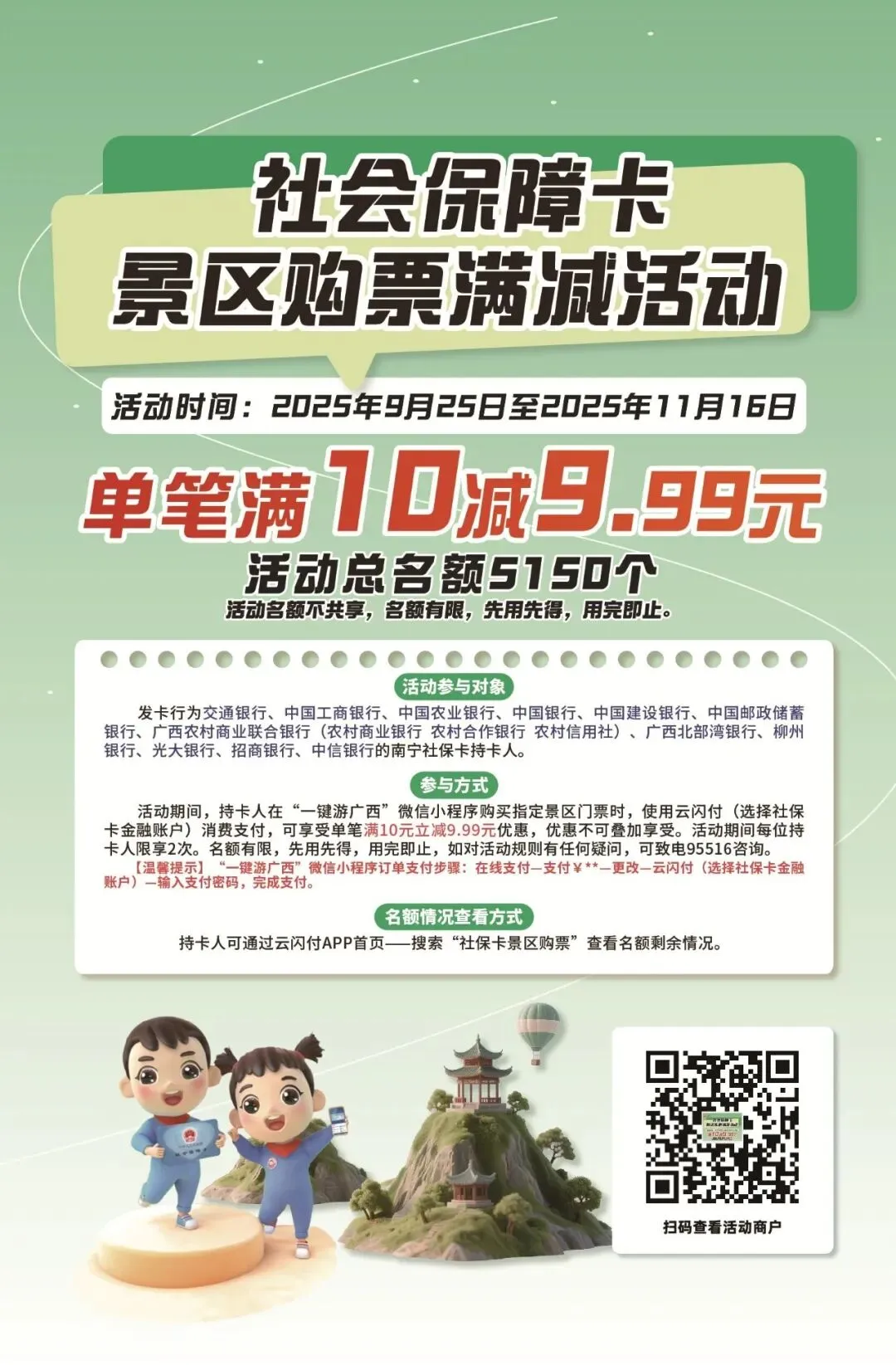 活动期间,持卡人在“一键游广西”微信小程序支付指定景区门票时,选择云闪付支付方式,如绑定了社保卡金融账户,即可享受单笔满10元立减9.99元优惠,优惠不可叠加享受。活动名额共5150个,活动期间每位持卡人累计可享2次。名额有限,先用先得,用完即止。
