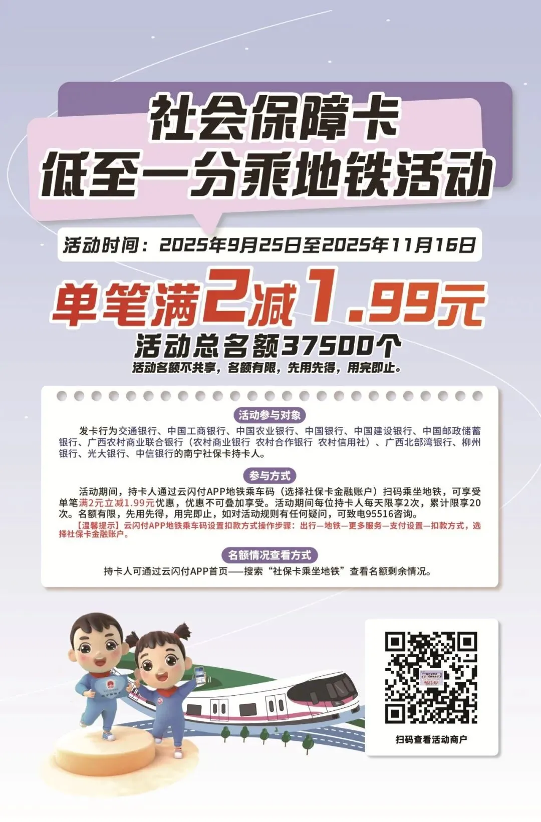 活动期间,持卡人通过云闪付APP地铁乘车码绑定社保卡金融账户扫码乘坐地铁,可享受单笔满2元立减1.99元优惠,优惠不可叠加享受。活动名额共37500个,活动期间每位持卡人每天限享2次,累计可享20次。名额有限,先用先得,用完即止。