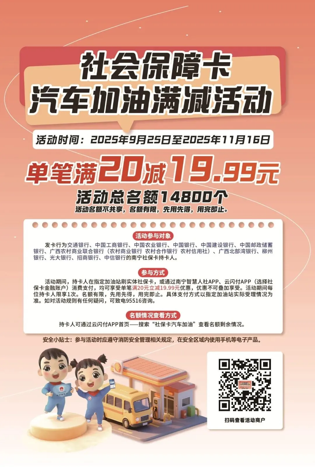 活动期间,持卡人在指定加油站刷实体社保卡,或通过南宁智慧人社APP、云闪付APP绑定社保卡金融账户消费支付,均可享受单笔满20元立减19.99元优惠,优惠不可叠加享受。活动名额共14800个,活动期间每位持卡人可享1次。名额有限,先用先得,用完即止。具体支付方式以指定商户实际受理情况为准。